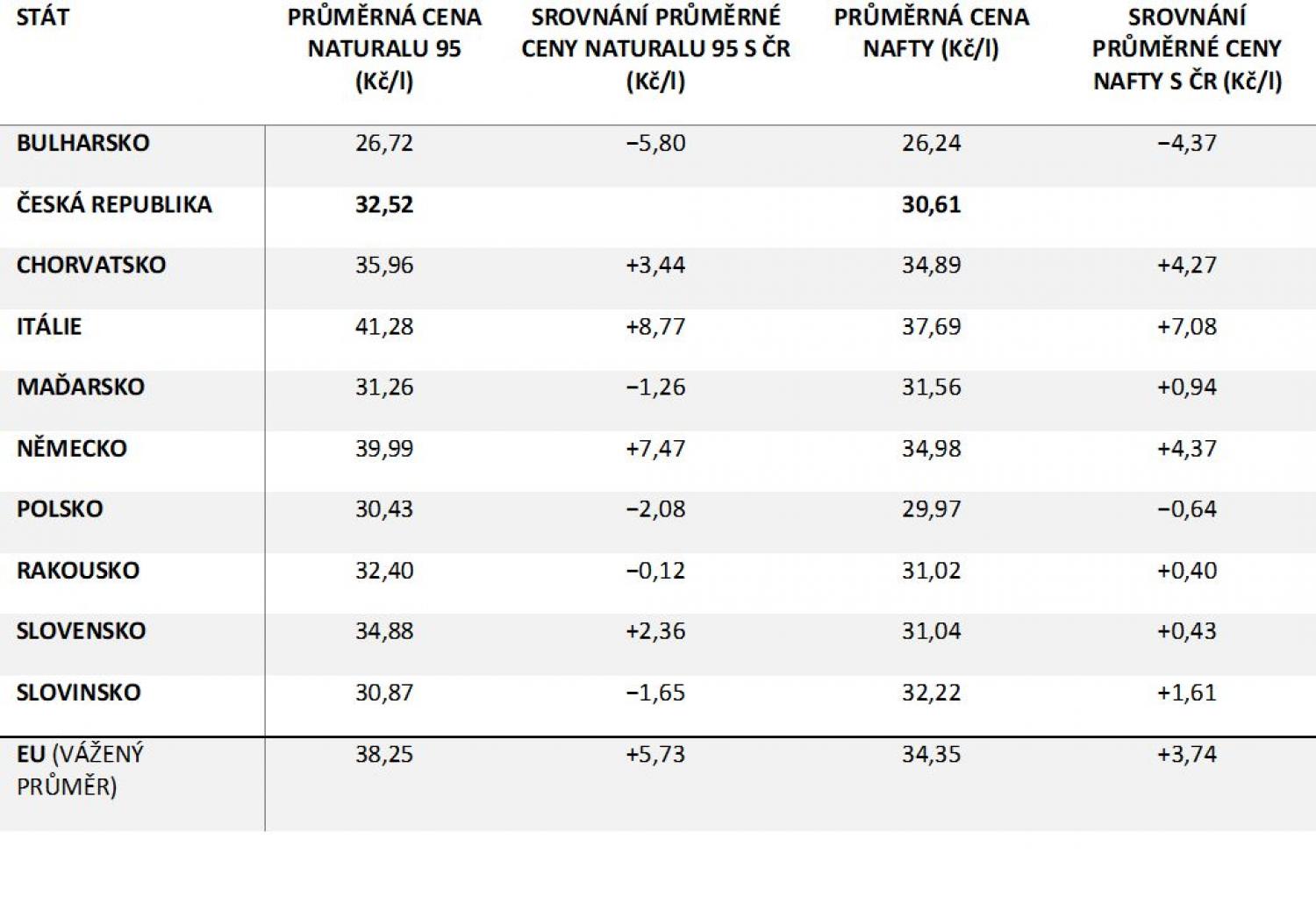 Ve srovnání se sousedními zeměmi je nafta levnější jen v Polsku (průměrně asi o 60 h/l), Natural 95 také v Polsku (více než o 2 Kč/l) a v Rakousku je cena srovnatelná. Na Slovensku je nafta jen mírně dražší, avšak za benzín si u našich východních sousedů čeští motoristé připlatí více než 2 Kč/l. V Maďarsku a ve Slovinsku jsou ceny paliv podobné, v obou případech je nafta v průměru asi o korunu, resp. 1,60 Kč/l dražší vůči Česku, ale benzín oproti tuzemskému průměru o 1,30 Kč/l, resp. 1,60 Kč/l levnější.
