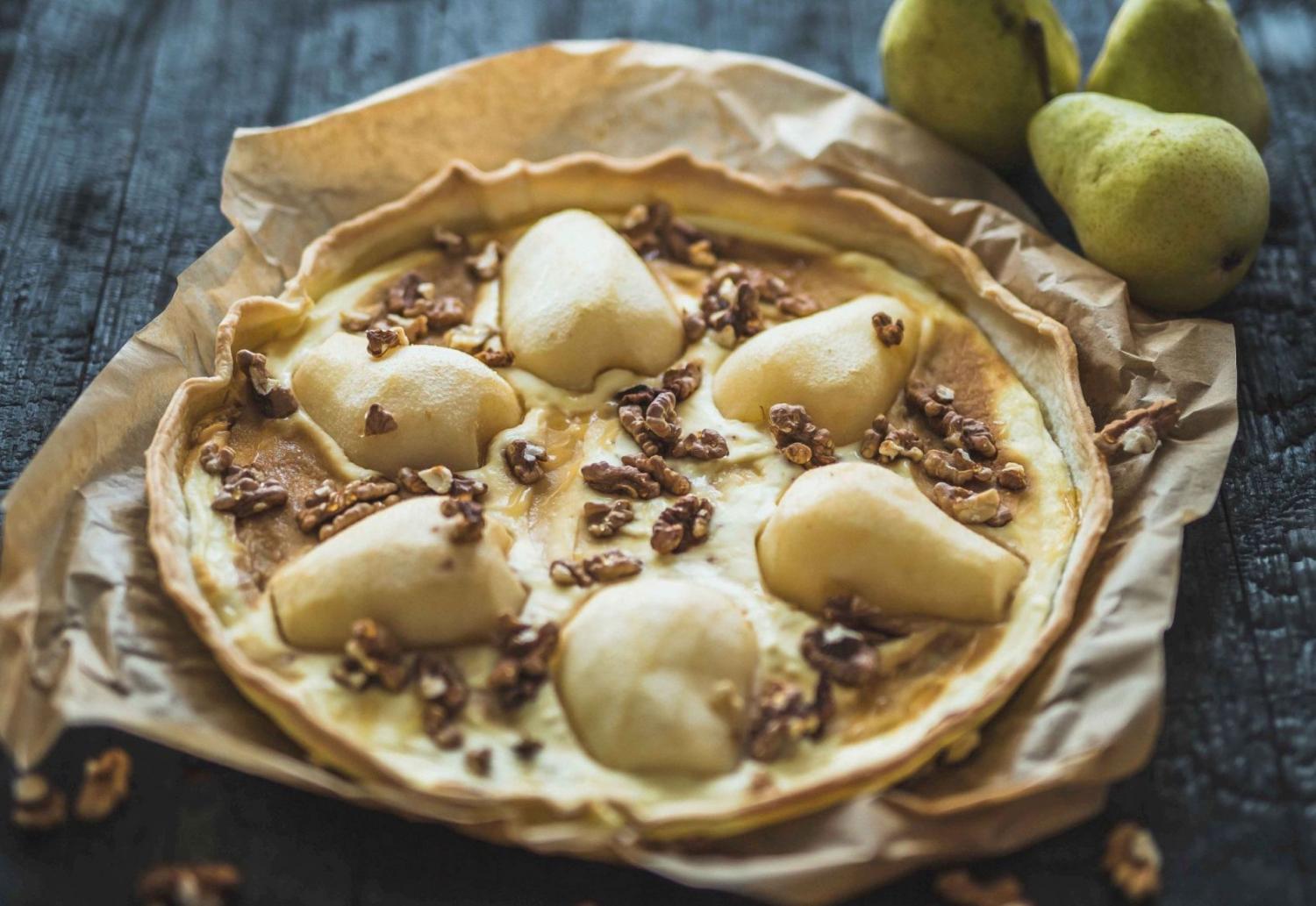 V misce smíchejte tvaroh, žervé, vejce, a extrakt. Směs rovnoměrně naneste na koláčové těsto, přidejte rozpůlené, oloupané a očištěné hrušky. Zasypte ořechy a zakapejte medem.