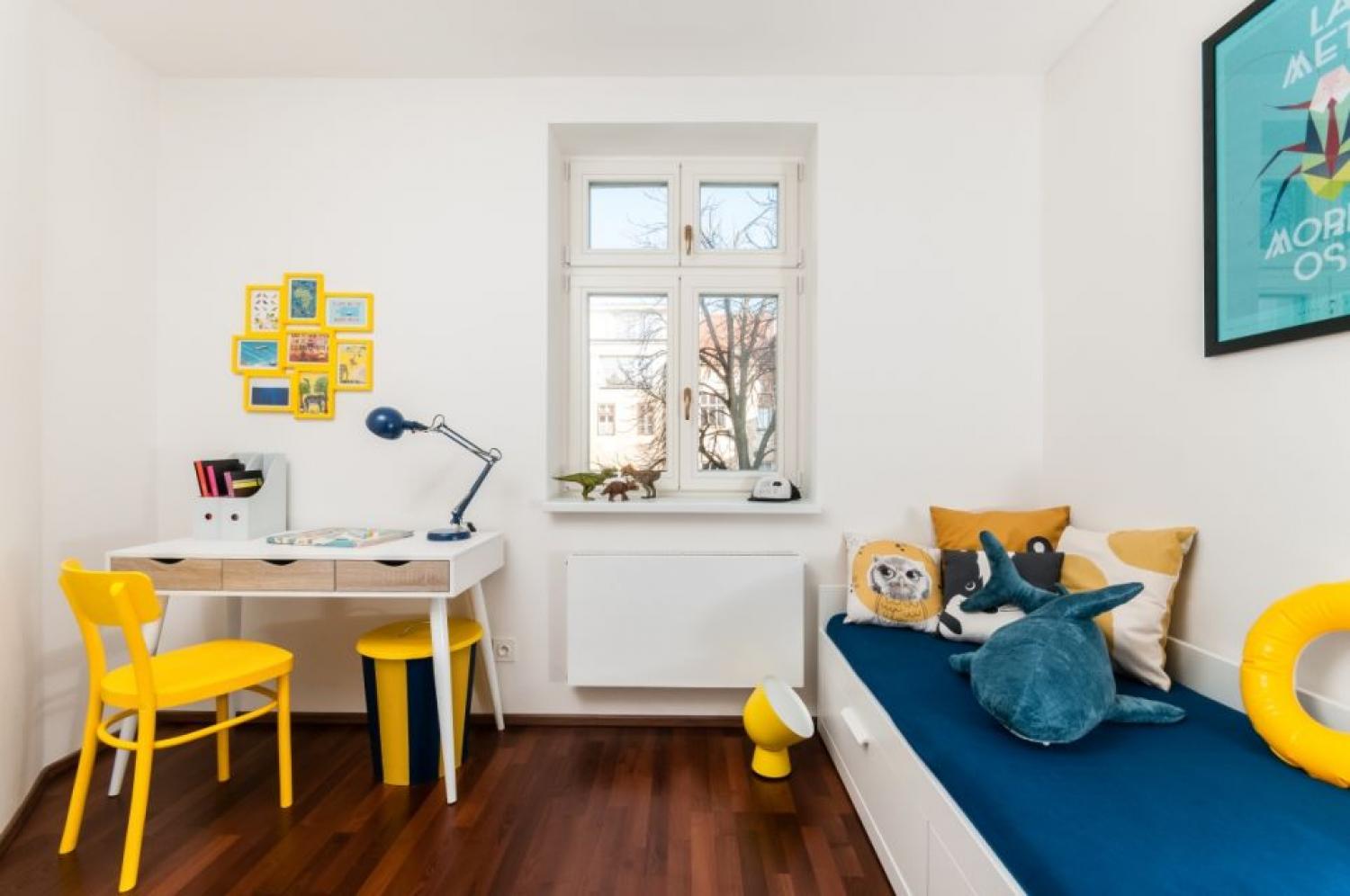 Pocit slunce, tepla a léta navodíme sytě žlutými doplňky, které kombinujeme s námořnickou modrou a neutrálními barvami (světle šedá), které utlumí původně převažující bílou. Z nudného interiéru se může stát optimistický a svěží prostor.