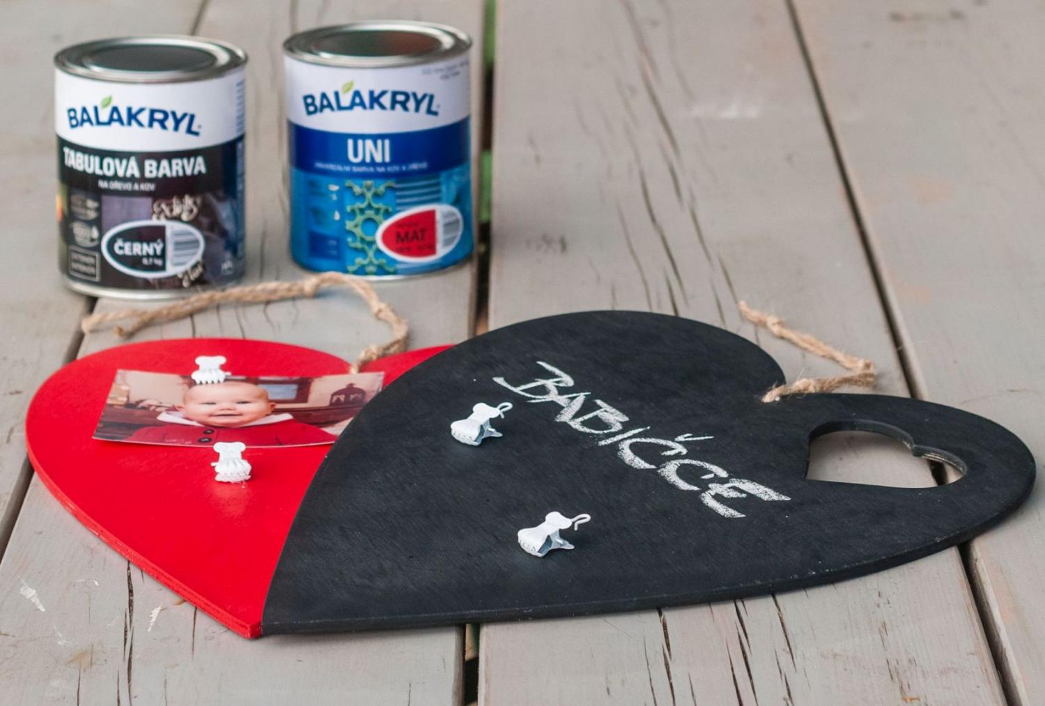 Barvu potřebujeme takovou, která perfektně kryje a je vhodná na dřevo. My jsme červené srdíčko natřeli červeným Balakrylem UNI mat a černé pak Tabulovou barvou Balakryl. Na černou Tabulovou barvu totiž ještě můžete napsat vzkaz klasickou křídou na tabuli. Bohatě stačil jeden nátěr, ale kdo chce mít barvu sytější a krytí 100%, může po zaschnutí (4–6 hodin) udělat ještě jednu vrstvu. Srdíčko je určené k zavěšení na zeď, proto jsme ho natírali jen z jedné strany.