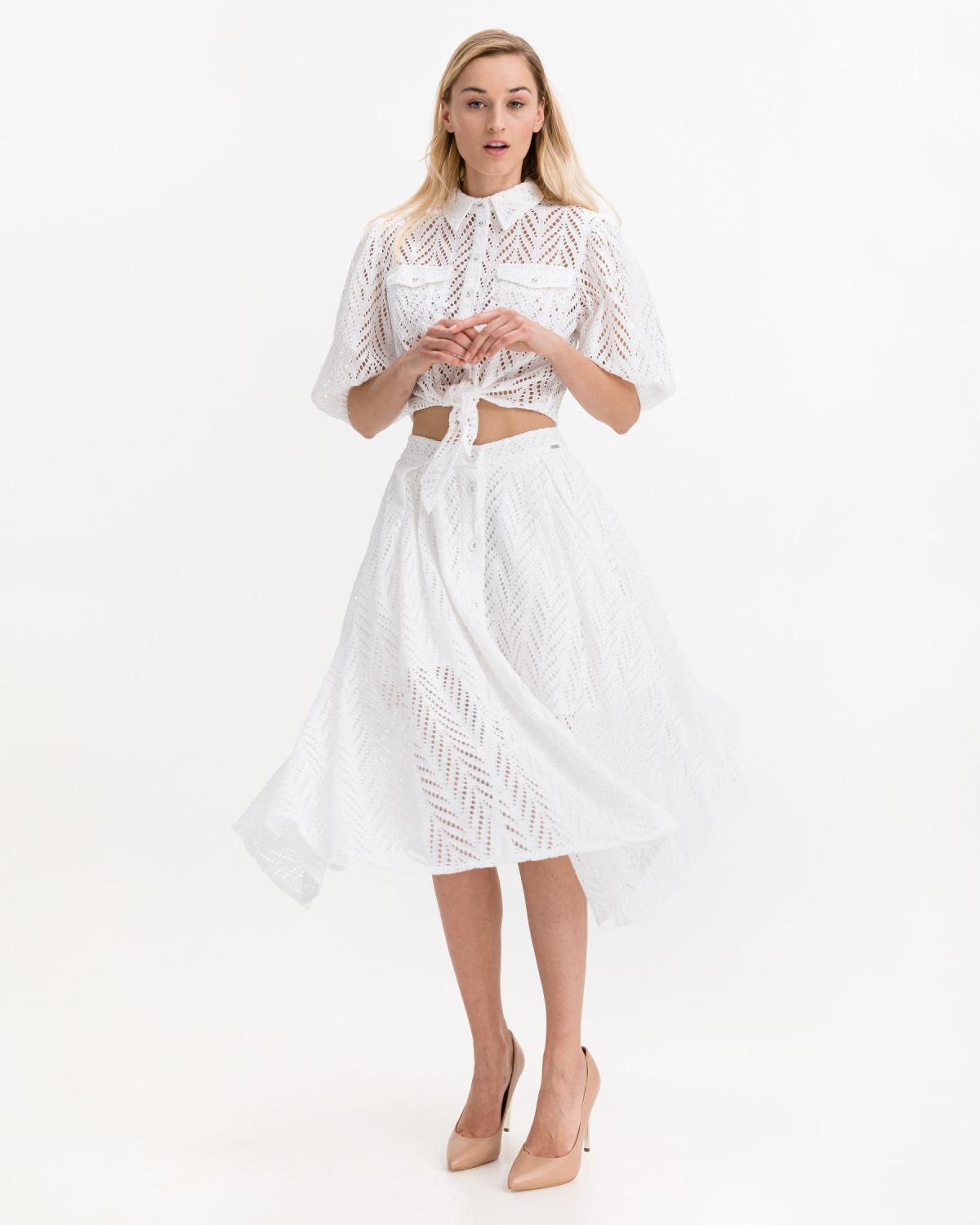 Dalším hitem letošního léta jsou takzvané Co-odrs neboli two-piece dress. Jedná se o šaty, které se skládají ze dvou kusů. Především z topu a sukně, které patří k sobě, ale můžete je využít také samostatně. Převážně jde o crop topy všech stylů, které již od loňska dominují trendům. Říkáte si, že nejsou pro vás, protože nemáte velikost XS, jako modelky? Nezapomeňte, že se doplňují především sukněmi (kalhotami) se zvýšeným pasem, takže odhalují pouze úzký pás pokožky. Zvolíte-li správný střih, nemusíte se jich obávat. A pokud nerada odhalujete svou kůži, je možné zvolit variantu s delším topem, třeba v kontrastním průhledném materiálu, který zakryje, co má, ale přitom vykouzlí efekt vrstvení.