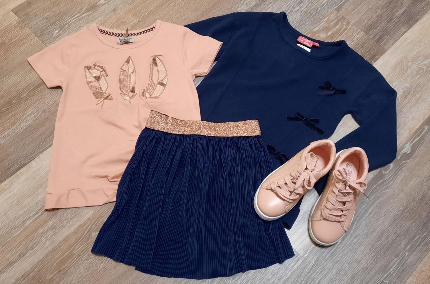 Vsadila jsem na jednoduchost, ladící barvy a detaily, a hlavně na praktičnost. K tmavě modré plisované sukýnce s třpytivou kontrastní měděnou pruženkou jsem zvolila praktické tričko v meruňkové barvě s vkusným obrázkem k této příležitosti. Rozhodně bych nedoporučila volit obrázky pohádkových hrdinů a podobně. Ty jsou spíš k méně formálním situacím. Myslela jsem také na počasí. Jelikož konec léta zatím vypadá, že se ponese v duchu přicházejícího podzimu, tak jsem outfit doplnila tmavě modrým svetříkem s decentními sametovými mašličkami ve stejném odstínu. V nabídce byl ještě ve světle šedé barvě s kontrastními detaily. Což by také mohla být výborná varianta.