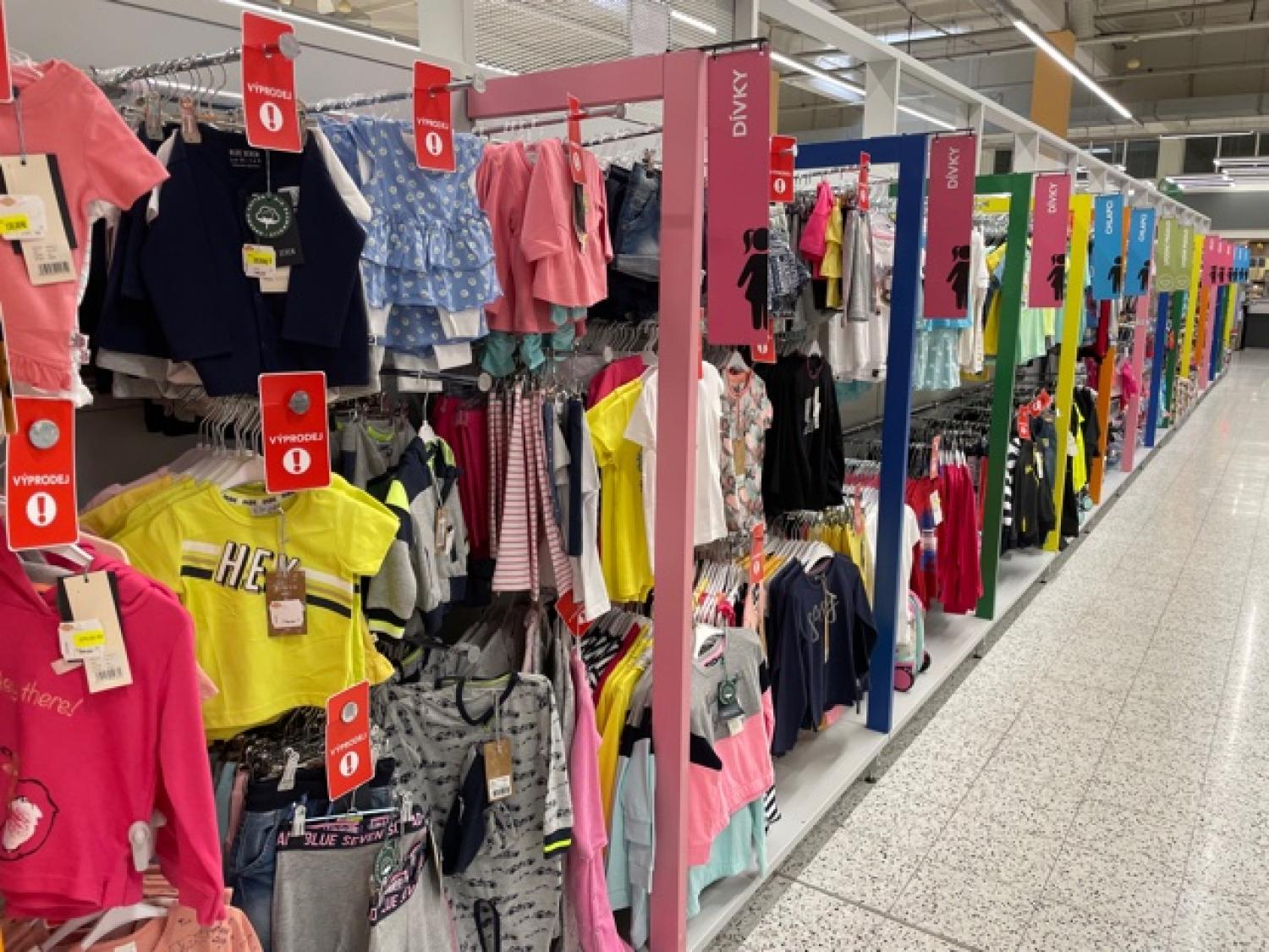 Na seznamu nechybí ani výbavička na tělocvik. Děti potřebují teplákovou soupravu a botasky, když půjdou cvičit ven. Naopak do školní tělocvičny nám byly doporučeny kraťasy, tričko a boty s bílou podrážkou, což je podmínkou. Klasické cvičky, jak známe, již tedy povinné většinou nejsou. Je potřeba také myslet na ponožky, jelikož děti v zimě často nosí punčocháče. To vše samozřejmě je potřeba do něčeho dát. Do košíku jsem tedy přidala také pytlík na cvičební úbor. Volila jsem látkový, aby propocené oblečení dobře dýchalo. Zda budete potřebovat pytlík také vy, si ověřte ve vaší škole. Někde již mají k tomuto účelu skřínky. Já jsem dnes oblečení a boty na tělocvik nekupovala. Máme je doma. Z cvičebních pomůcek, jsme dostali za úkol pořídit jen míč a švihadlo, jinak veškeré vybavení poskytuje škola. Sekce dětského oblečení už prošla modernizací. Regály jsou přehledně rozdělené a popsané a z velké nabídky zboží se dobře vybírá.