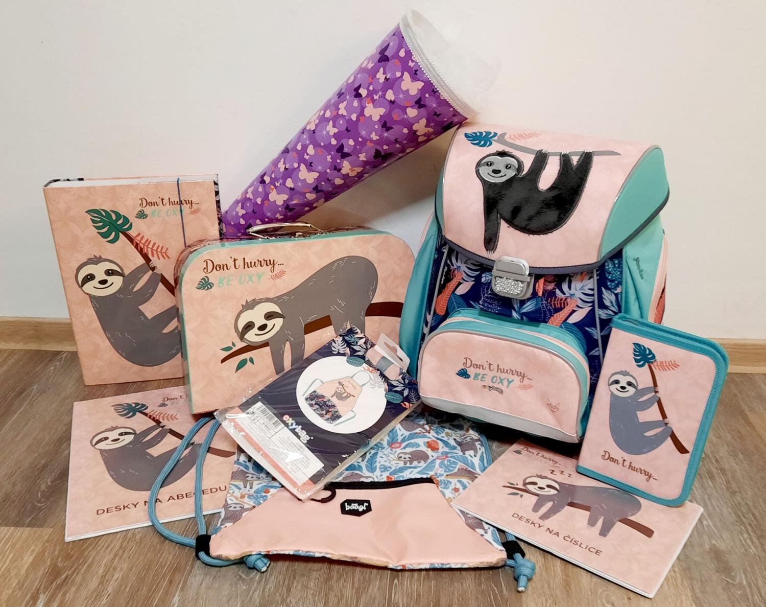 Velmi oceňuji možnost dokoupit si k aktovce ve stejném designu mnoho dalších doplňků. Lenochod tedy bude Valinku doprovázet první třídou také na klasickém odklápěcím penálu, deskách na abecedu a čísla, složkách na sešity, kufříku na výtvarné potřeby, zástěrce i desce na modelování do výtvarné výchovy. Nezapomněla jsem ani na přezůvky a pytlík, ve kterém je bude nosit.
