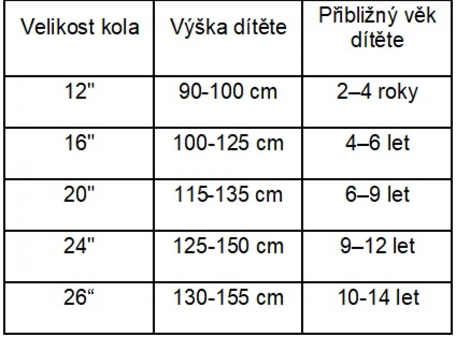 A jak tedy vybrat správně? Začněme u velikosti kola, která hraje při výběru klíčovou roli. Podívejte se na tabulku velikostí, jež vám nabídne základní orientaci. Pro určení vhodné velikosti se doporučuje, aby si dítě kolo na prodejně vyzkoušelo. Správná velikost dětského kola se určuje dle volného místa mezi rámovou trubkou a rozkrokem – mělo by zde být místo cca na pěst. Kromě toho musí dítě nekomplikovaně dosáhnout ze sedla kola na řídítka. Dosáhnutí na pedály či na zem nesmí činit potíže jakbysmet.