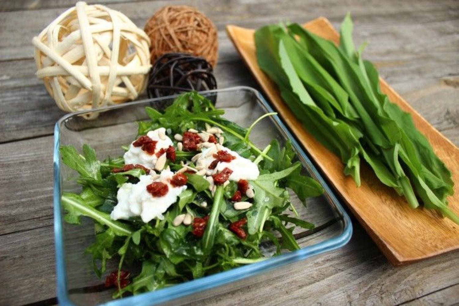 Rukolu důkladně omyjte spolu s medvědím česnekem, do mísy spolu s nimi přidejte pokrájená sušená rajčata (pokud budou příliš vyschlá, pak je potřeba je předem namočit), nakrájejte šalotku nebo menší červenou cibuli, syrovátkový sýr, přidáme citronovou šťávu, olej, sůl, pepř, důkladně promícháme.