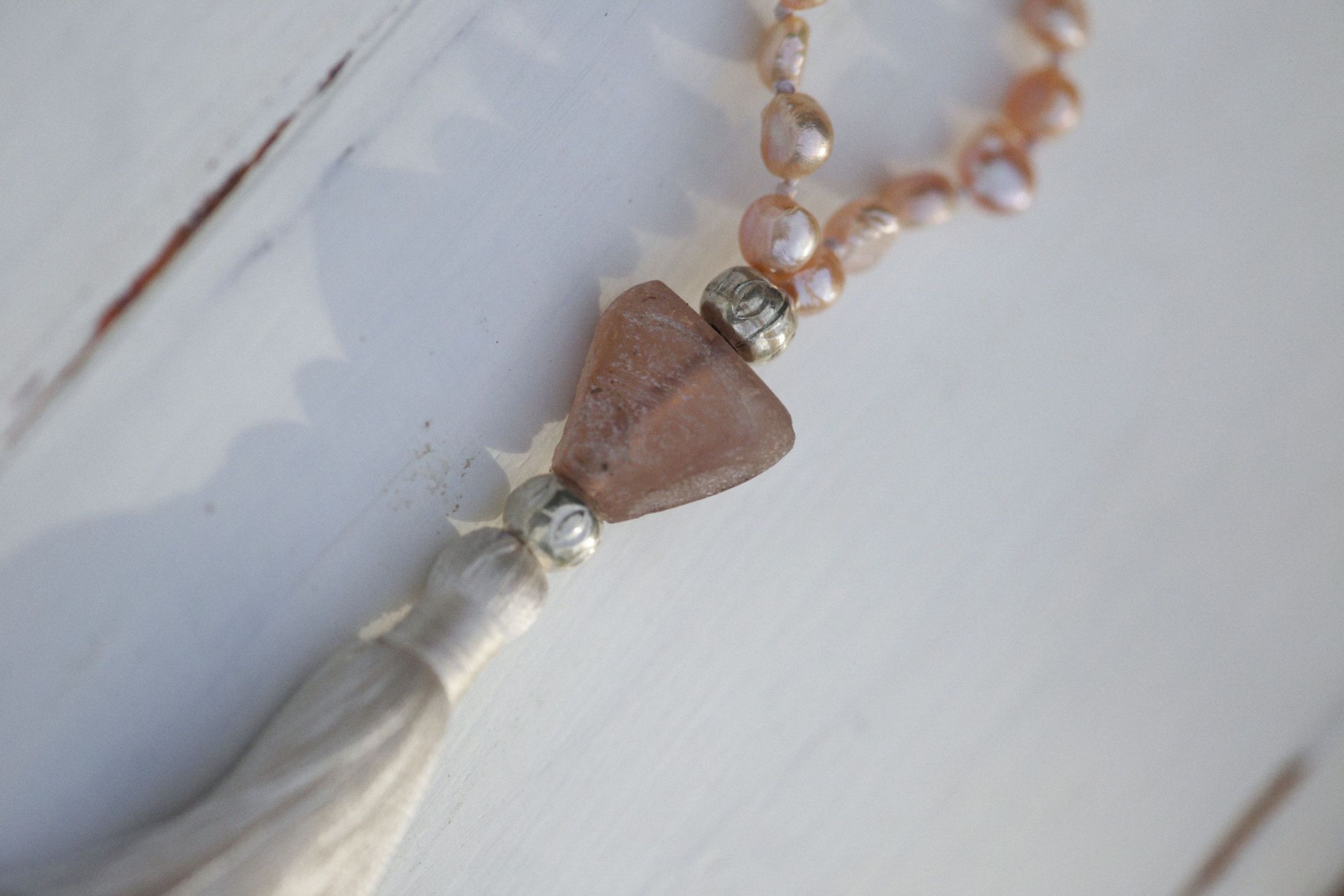 Po zhruba měsíci jsem opět při nevědomém hraní držela malu v rukou. Přetrhla se. Myslela jsem zrovna na to, jak se uvnitř zklidňuju a procházela jsem změny, které nastaly během nošení. Nelžu! A ona se přetrhla. Vlastně mi dala znamení, že je už vše v pořádku, a že se už nemusím bát. Začala jsem se smát a volala lektorce, jak se opravuje. „Musíte si pomoct sama. V tom je ta moudrost. A to, že se přetrhla, význam rozhodně má.“ Díky precizní ruční práci je každý korálek (slza) podvázaná hedvábnou nití, takže se náhrdelník nerozsypal. To bylo naprosto kouzelné. Lekla jsem se, ale vlastně se nic nestalo. Navázání jsem obnovila a přitom jsem děkovala.