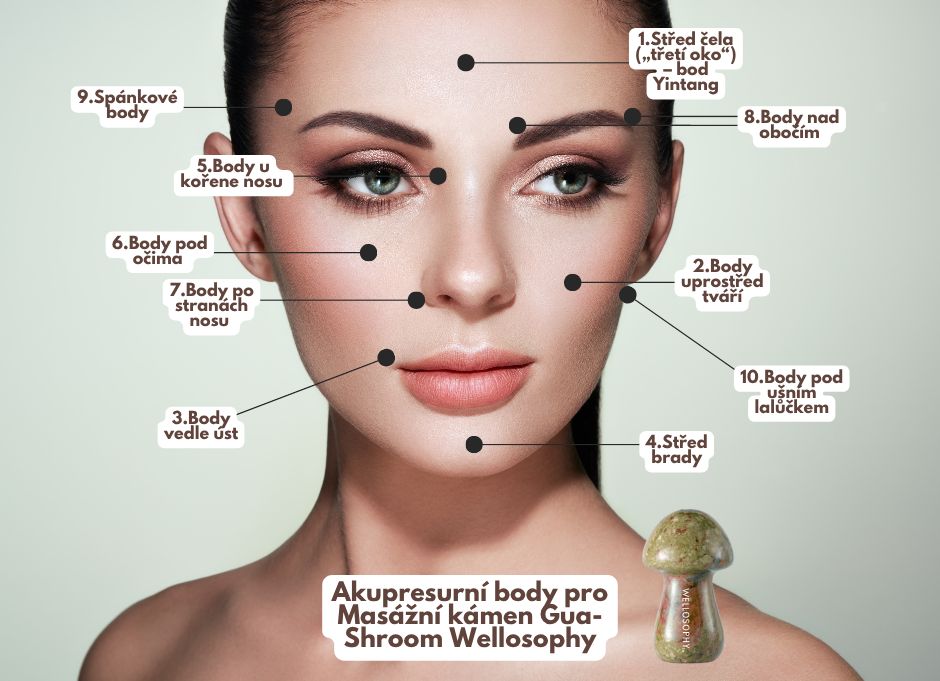 V závěru masáže se kloboučkem Gua-Shroom zaměřte na akupunkturní body tváře – například uprostřed čela, pod lícními kostmi a vedle úst – pomůžete tak uvolnit napětí ve svalech, rozproudit lymfu a rozjasnit pleť. Každý bod tiskněte 10–15 vteřin.