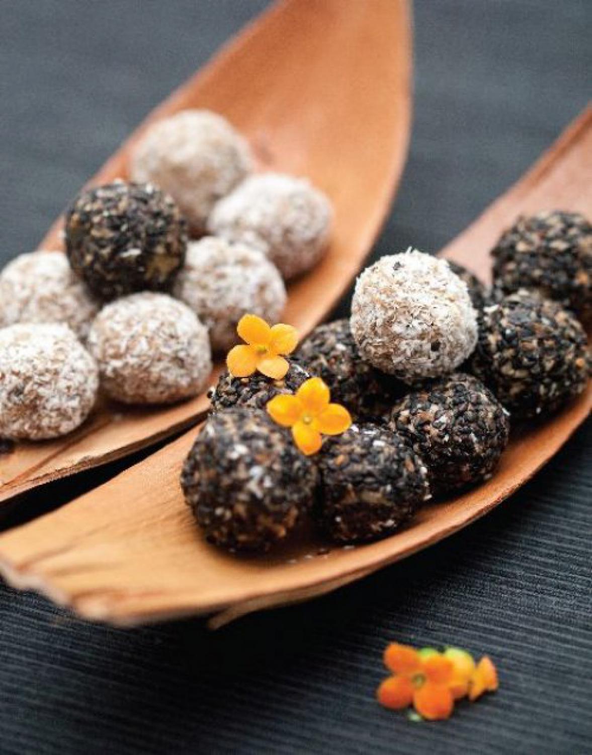 Datlové pyré smícháme se švestkami, dýňovými semínky, kokosovou moučkou, kokosovým olejem, vanilkou a vlašskými ořechy. Poté vytvarujeme kuličky. Polovinu obalíme v kokosové moučce a polovinu v nasucho opraženém černém sezamu.